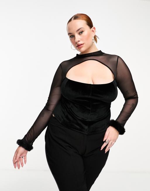 ASOS DESIGN Curve Halloween velvet corset top with mesh sleeves in black | ASOS